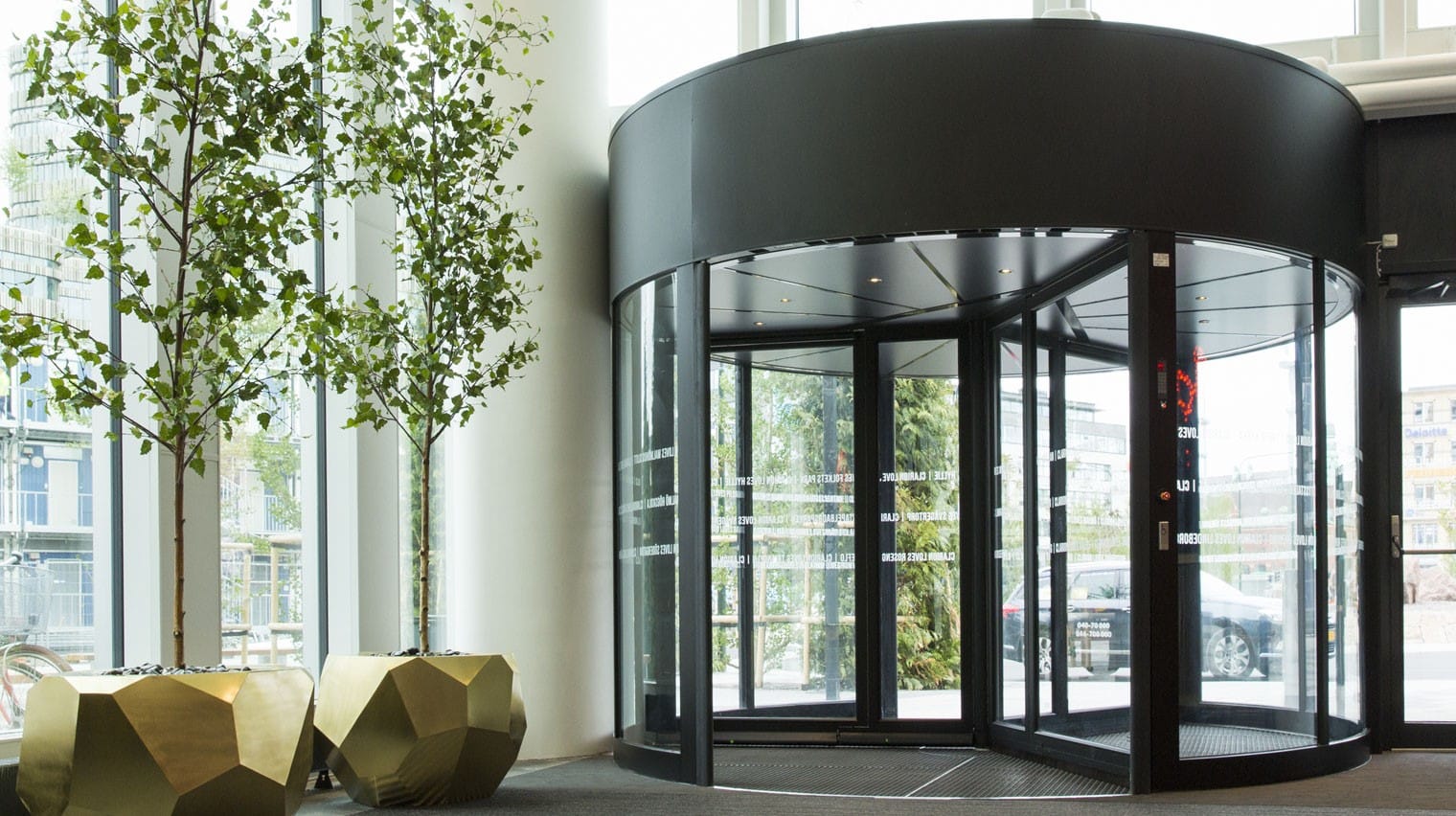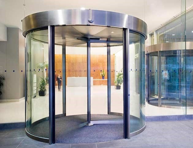 درب چرخشی شیشه ای معمولا دارای یک موتور پر قدرت می باشد. این درب ها می توانند با انواع شرایط اقلیمی هماهنگی داشته باشند. از این نوع درب می توان برای فضاهای کوچک و بزرگ استفاده نمود. اتصال سیستم های جانبی به درب اتوماتیک گردان امکان پذیر می باشد. با این روش می توان بر ورود و خروج افراد نظارت نمود. در بسیاری از پروژه ها فقط برای لوکس نشان دادن ساختمان از این نوع درب استفاده می شود.
